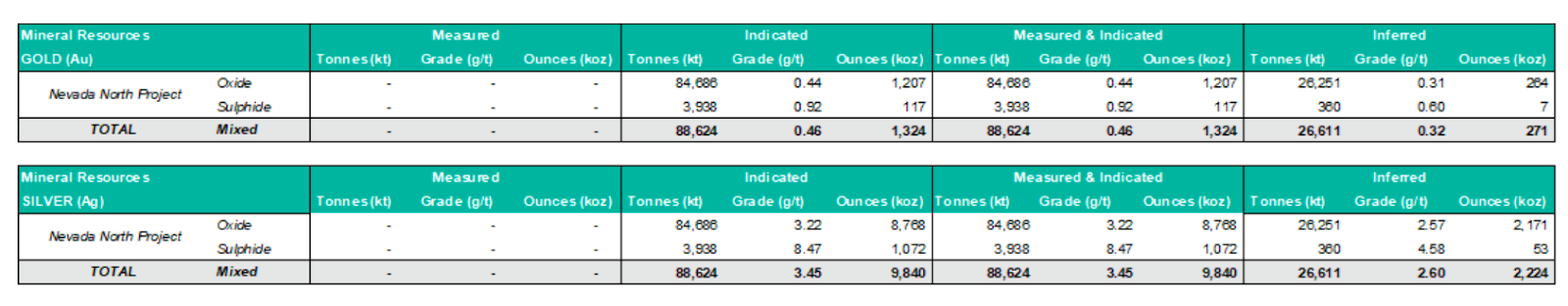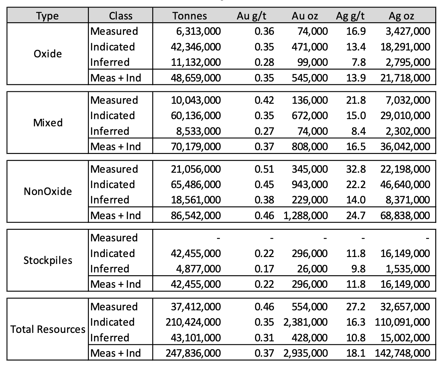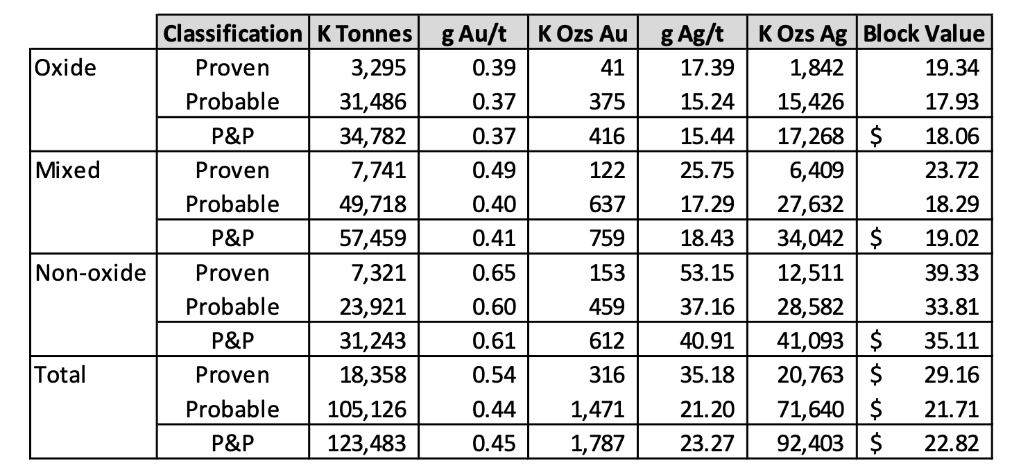 Mill (non-oxide): 51% gold, 75% silver average recovery