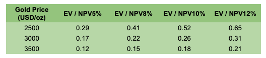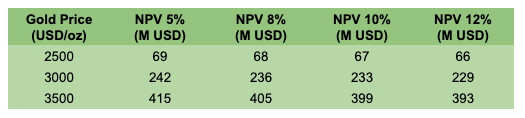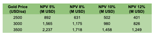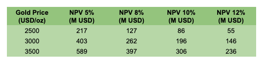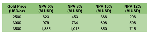 For each project, I’ll estimate after tax NPV using three gold price environments—$2,500, $3,000, and $3,500/oz—and four discount rates—5%, 8%, 10%, and 12%,