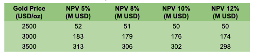 Extending the mine life by 3 years increases total gold output by 50%—from 420,000 oz to 630,000 oz—and results in an average ~32% uplift in NPV across gold price and discount rate scenarios. At $3,000/oz gold and an 8% discount rate, the NPV rises from $179M to $236M, a $57M increase—notable when compared to Integra’s current enterprise value of $259M.