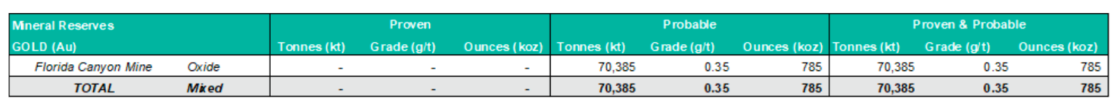 Located 125 miles east of Reno, Nevada, and adjacent to Interstate 80 near the town of Imlay, the Florida Canyon Mine is Integra’s sole producing asset and core cash-flow generator. The mine lies in Pershing County within the prolific Humboldt Range and is operated by Integra’s subsidiary, Florida Canyon Mining Inc. (FCMI). The property spans approximately 18,800 acres, combining fee land, patented claims, and 656 unpatented mining claims. Access is year-round, and infrastructure is well developed, including power lines, water rights, and proximity to mining support hubs such as Winnemucca and Lovelock.Reserves
