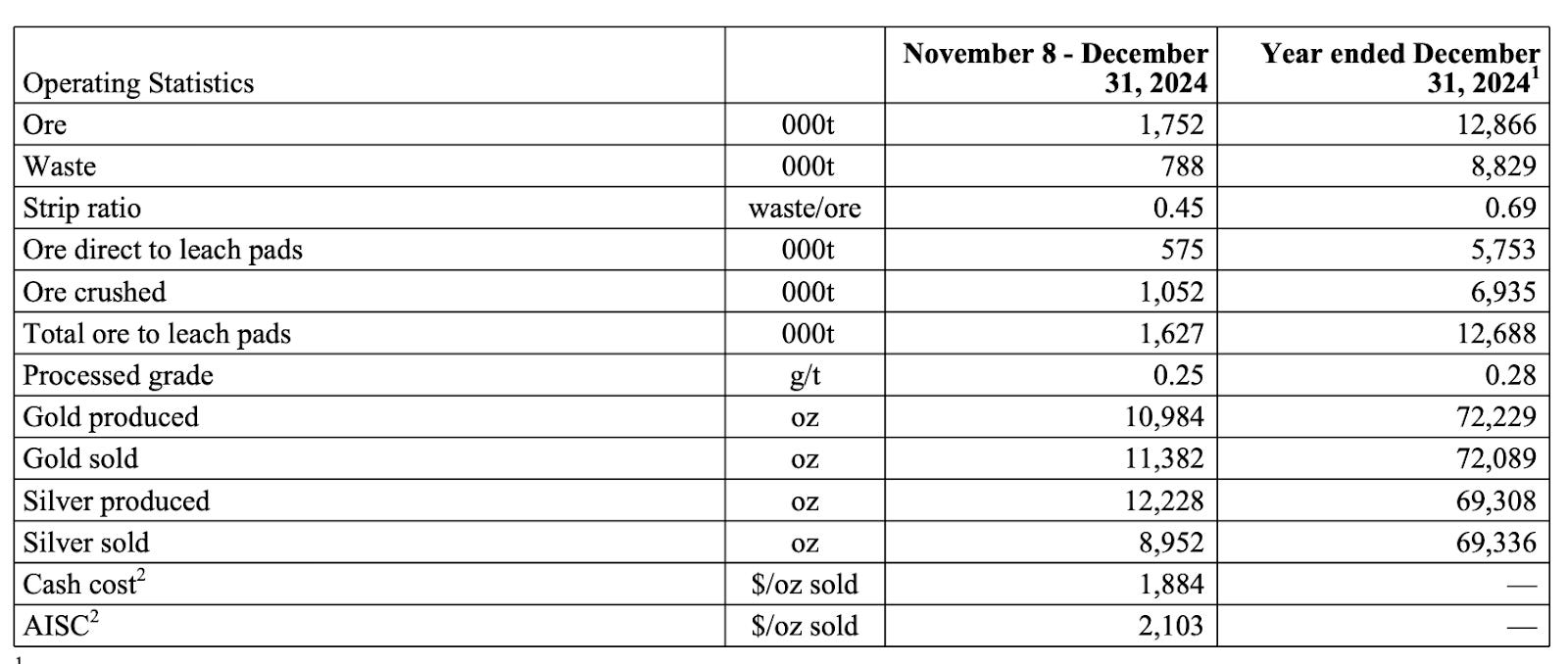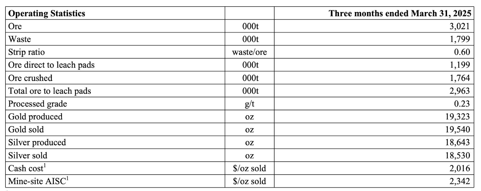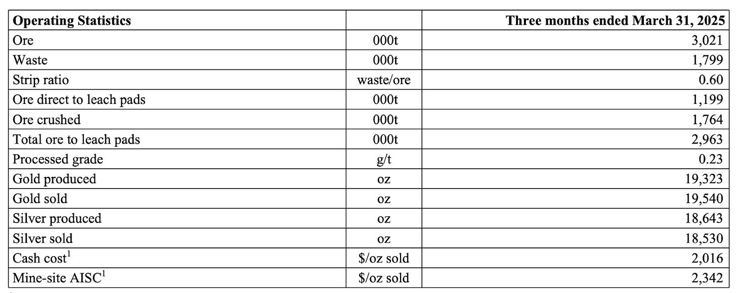 Operations in Q1 2025 continued at a strong pace, with 3.0 million tonnes of ore placed on the pads and a strip ratio of 0.60. Gold production totaled 19,323 ounces, exceeding expectations due to a one-time recovery of ~2,000 ounces of gold from electrowinning tank cleanup—an efficiency project completed early in the year. Additional gains were driven by improved solution flow rates and full commissioning of the new carbon-in-column (CIC) circuit. Gold sales for the quarter reached 19,540 ounces, with cash costs of $2,016/oz and mine-site AISC of $2,342/oz. Total AISC, including corporate-level costs, amounted to $2,446/oz.