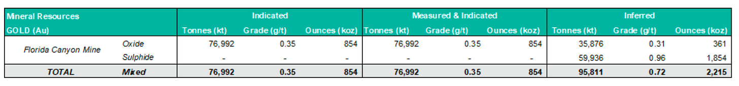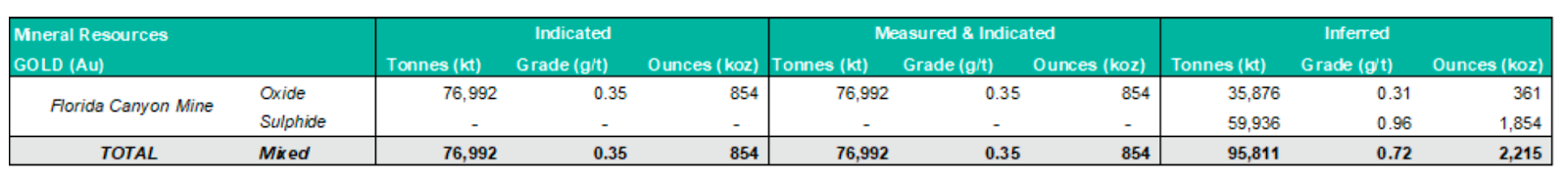 Measured and Indicated (M&I) resources, inclusive of reserves, stand at 77.0 million tonnes grading 0.35 g/t for 854,000 ounces of gold. Inferred resources total 95.8 million tonnes at a higher average grade of 0.72 g/t, equating to 2.22 million ounces. However, the majority of this inferred material is sulfide-hosted and not amenable to Florida Canyon’s current heap leach processing setup. Recovering gold from this material would require construction of a sulfide-capable mill and potentially oxidative treatment, which is not part of the existing mine plan.